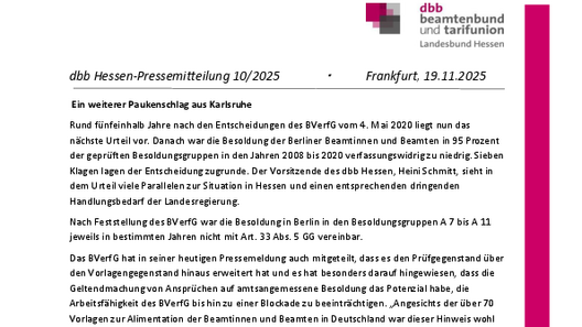 Rund fünfeinhalb Jahre nach den Entscheidungen des BVerfG vom 4. Mai 2020 liegt nun das nächste Urteil vor. Danach war die Besoldung der Berliner Beamtinnen und Beamten in 95 Prozent der geprüften Besoldungsgruppen in den Jahren 2008 bis 2020 verfassungswidrig zu niedrig. Sieben Klagen lagen der Entscheidung zugrunde. Der Vorsitzende des dbb Hessen, Heini Schmitt, sieht in dem Urteil viele Parallelen zur Situation in Hessen und einen entsprechenden dringenden Handlungsbedarf der Landesregierung.