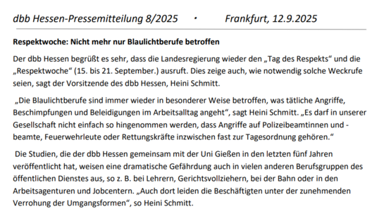 Der dbb Hessen begrüßt es sehr, dass die Landesregierung wieder den „Tag des Respekts“ und die „Respektwoche“ (15. bis 21. September.) ausruft. Dies zeige auch, wie notwendig solche Weckrufe seien, sagt der Vorsitzende des dbb Hessen, Heini Schmitt.