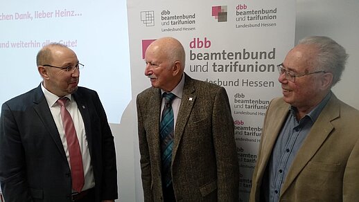 Landesbundvorsitzender Heini Schmitt (links) dankt Justiziar Heinz Fischer, der 50 Jahre schon für den dbb tätig ist. Rechts: Weggefährte und Ehrenvorsitzender Walter Spiess