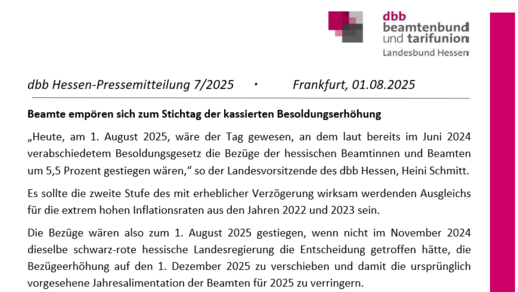 „Heute, am 1. August 2025, wäre der Tag gewesen, an dem laut bereits im Juni 2024 verabschiedetem Besoldungsgesetz die Bezüge der hessischen Beamtinnen und Beamten um 5,5 Prozent gestiegen wären,“ so…